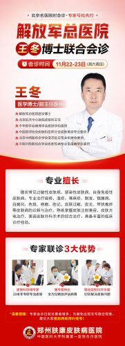 11月22日-23日(本周末),郑州肤康皮肤病医院为帮助河南疑难皮肤病患者早日实现健康无恙 解决“看病难、看病贵、看专家更贵”的问题特邀解放军总医院王冬博士莅临肤康进行联合会诊。