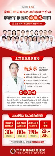 12月13日-14日,北京资深教授杨庆永赴郑州肤康皮肤病医院亲诊,网上预约方便快捷,提前预约可免去您到院挂号和排队等候的烦恼,注意每天仅限20名。